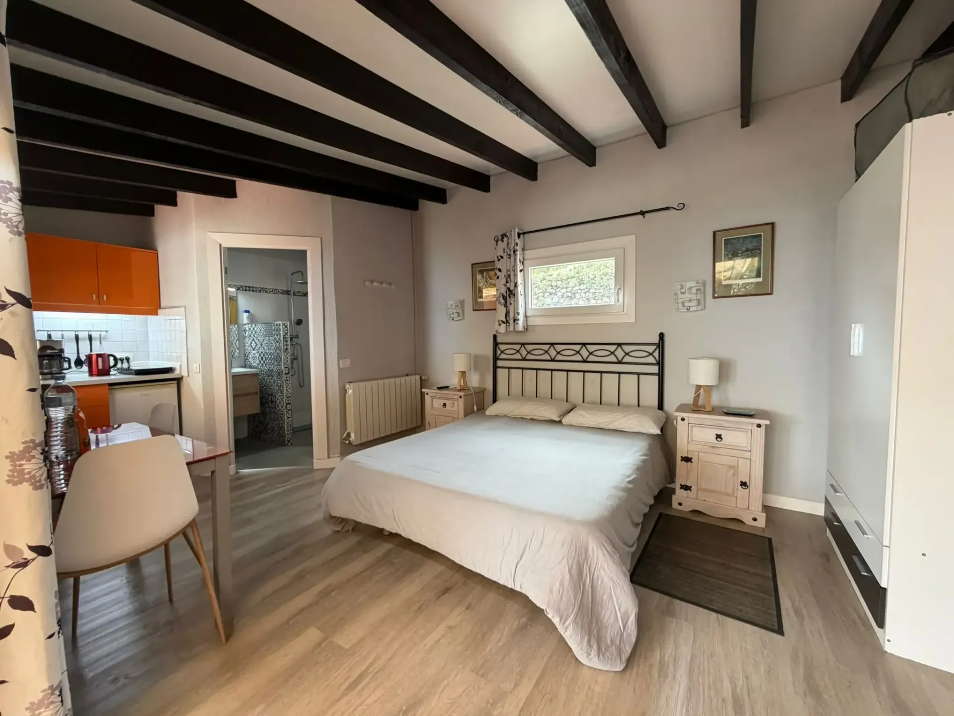 Acogedor estudio con cocina americana totalmente equipada, zona de estar con chimenea decorativa y cama doble. Baño completo con azulejos artesanales de colores. Amplia terraza privada con toldo motorizado, barbacoa y vistas panorámicas al valle de Los Realejos y al Atlántico.